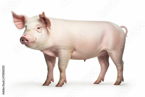 Pig standing on a white background. Animal side portrait.