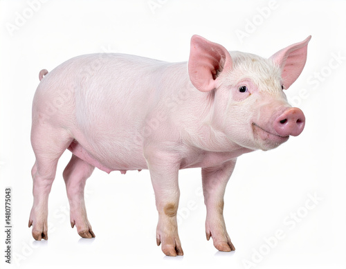 pig, farm animal, animal, mammal, pork meat, meat, farm, agriculture, white, isolated, studio, background, looking away, domestic, pink, young, cute, standing, full-length, half face, profile, snout, ear, hoof, tail, healthy, clean, purebred, food, diet, nourishment, protein, fat, bacon, ham, sausage, breeding, genetic, veterinary, animal welfare