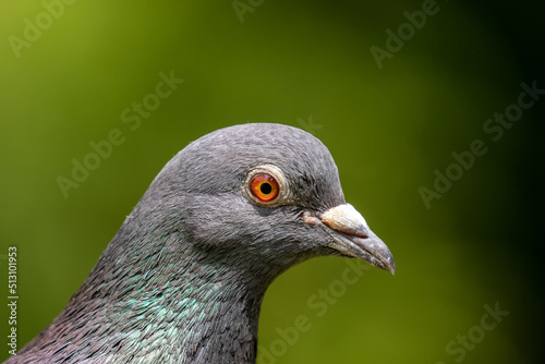Pigeon head with orange red eye in close up with neutral clean background