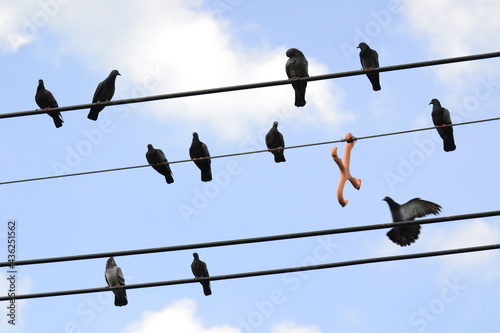wire, sky, bird, bird, blue, line, barbed, nature, cable, pigeon, electric, animal, wire, security, flock, power, sitting, row, black, group, fly