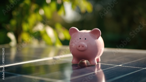 Piggy Bank on Solar Panel Illustrating Savings and Green Energy Investments for the Future