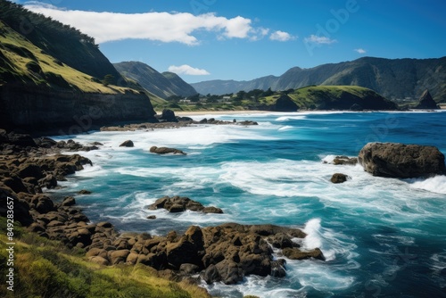 Piha Beach majestic waves and stunning landscapes in Auckland, New Zealand., generative IA