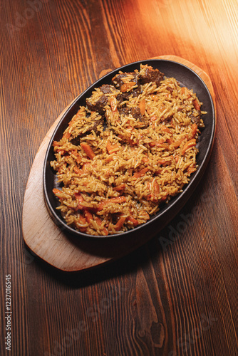 pilaf, food, dish, meal, dinner, traditional, rice, epicure, cookery, healthy, delicious, cooking, meat, lunch, background, closeup, vegetable, asian, hot, cooked, carrot, beef, fried, wooden, red, tasty, national, pepper, kitchen, indian, green, lamb, spicey, nourishment, grain, eastern, eat, arabic, rustic, spice, diet, plate, fresh, cook, turkish, garlic, brown