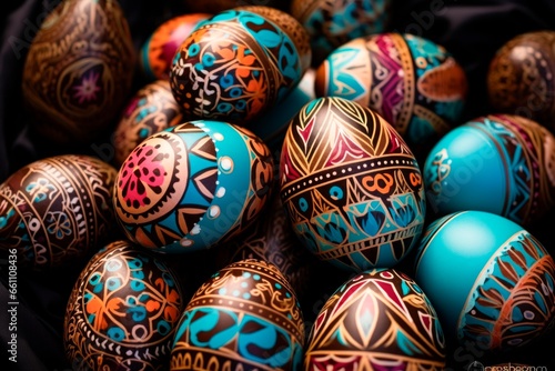 Pile of birght and colorful detailed hand painted Easter Eggs