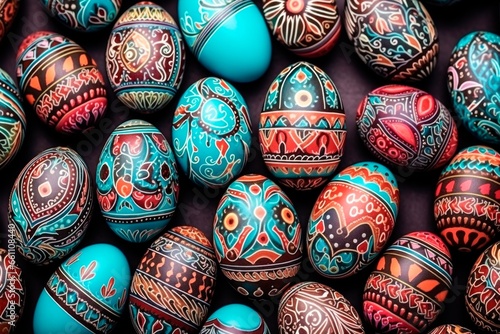 Pile of birght and colorful detailed hand painted Easter Eggs
