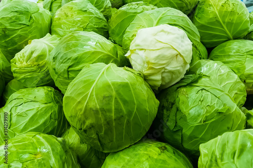 pile of cabbages in the market. Fresh vegetables cabbage.