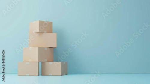 Pile of cardboard boxes against a blue wall, symbolizing shipping, moving, or storage. Minimalistic image with ample negative space. 3D Illustration.