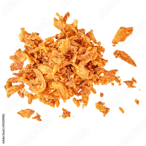 Pile of crispy fried onions isolated on white. Roasted Onion caramelized flakes top view. Flat lay.