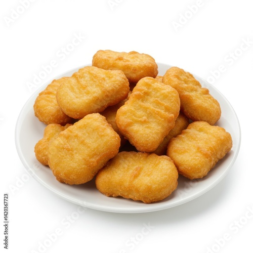 nugget, chicken, plate, food, fried, meal, fast food, dinner, lunch, delicious, poultry, portion, dish, snack, gold, tasty, cookery, cooked, eatery, eat, crispy, junk food, fresh, unhealthy, nourishment, cutlet, serving, white, background, closeup, shot, present, pile, appear