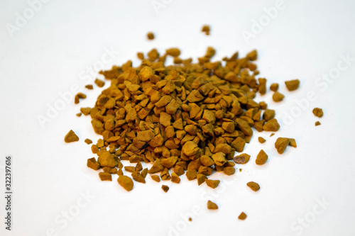 Pile of ground coffee powder or instant coffee grain isolated on white background. Shot of top view on brown granules.