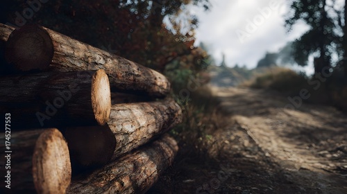 log, wood, forest, road, autumn, rural, nature, timber, tree, outdoors, rustic, pile, stack, raw, material, resource, natural, timberland, path, trail, dirt, ground, earth, fall, season, foliage, leaf, canopy, sky, overcast, cloudy, light, sunlight, lighting, wilderness, remote, country, landscape, wood grain, bark, rough, texture, earthy, brown, green, grey, soft, depth