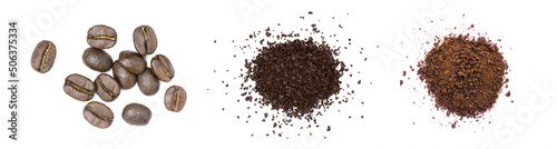 Pile of roasted coffee beans and coffee powder (ground coffe) isolated on white background. Top view. Flat lay.