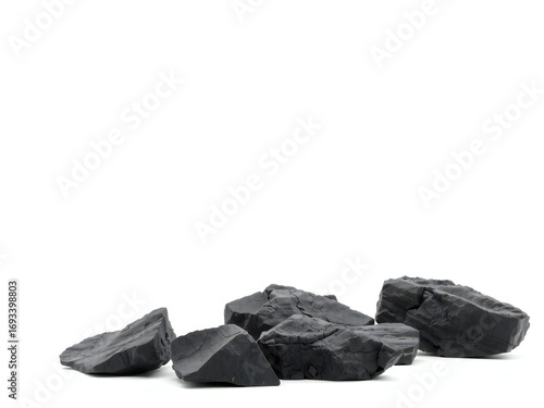 Pile of rough dark gray rocks on a white background