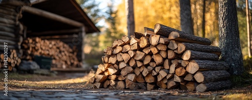 pile of rustic firewood stacked in front of logs and towering trees, earthy natural textures, woodland backdrop, cozy and inviting outdoor firewood scene, rustic charm