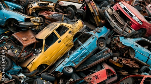 Pile of scrap waste of cars for recycling. Smashed destroyed car wrecks on car junkyard