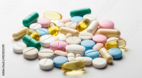 Pile of various colorful pills and capsules on white background. Medicine and healthcare concept for pharmacy banner or drug illustration.