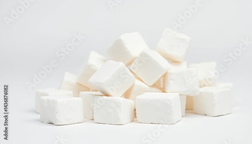 Pile of White Square Marshmallows Isolated on White Screen Background for Ads Promotion and Studio Photography Featuring Clean Backdrop in Realistic Style and Studio Lighting
