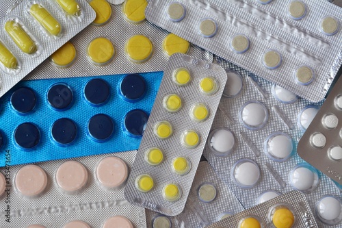 Pills for the treatment of diseases. Pandemic virus around the world. Vitamins close-up.