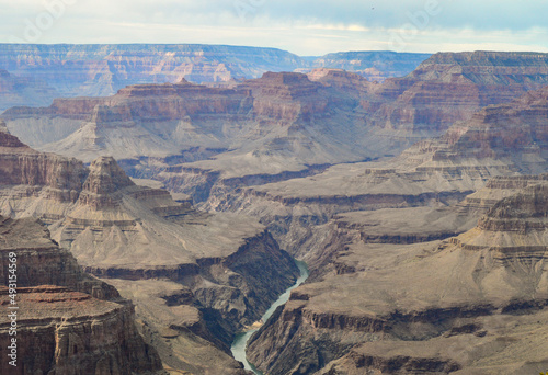 Pima Point view of the Grand Canyon and green waters of the Colorado River under cloudy skies in the national park's South Rim Trail.
