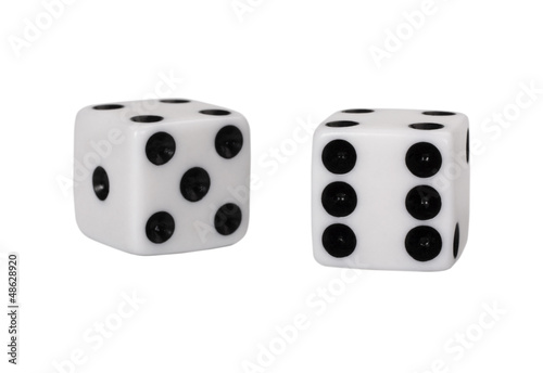 chance, dice, entertainment, luck, risk, black, closeup, color image, concept, connection, cube, gambling, horizontal, idea, no people, number, pair, pattern, photo, spotted, still life, studio shot, two objects, white, clipping path, cut-out, white background, fortune, game