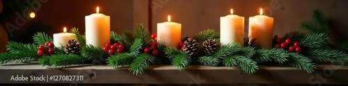 Pine branch arrangement with candles, pinecones and berries on a wooden mantle, holiday, wood, candle