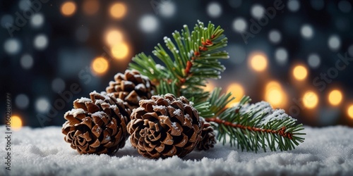 Pine cones and evergreen branches, dusted with snow and set against a backdrop of warm, glowing lights, evoke a festive and wintry atmosphere. AI generated.