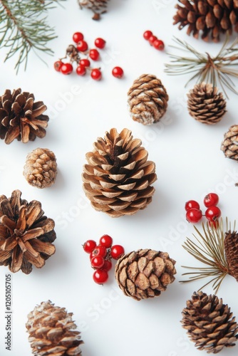 pine, cone, red, berry, surface, closeup, white, natural, decoration, life, arrangement, festive, holiday, winter, season, evergreen, botanical, fruit, flora