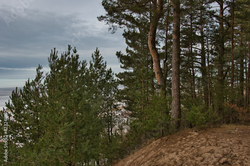 Pine forest on the slopes of the sandy hills of the Baltic Sea coast in early spring under a cloudy sky.