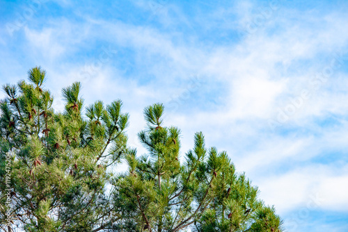 pine, tree, tree branch, background, needle, sky, cloud, blue, wallpaper, forest, horizontal, photo, no people, nobody, banner, copy space, blank, empty, green, nature, landscape, plant, beautiful, park, calmness, evergreen, coniferous