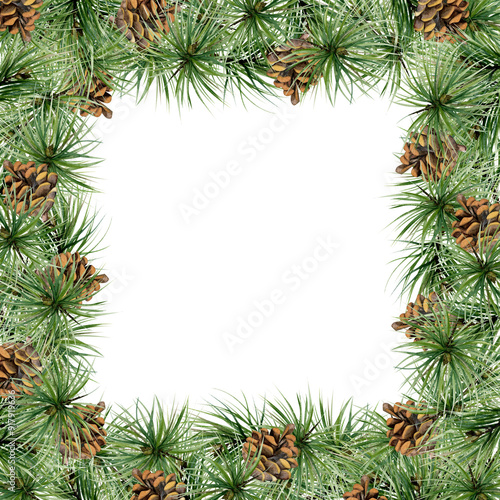 Pine tree, fir tree, spruce branches with needles, cones. Watercolor hand drawn illustration, border frame isolated on white. Xmas, happy new year festive, noel navidad. Cards, gifts, florist.