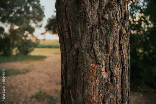 Pine tree forest with bokeh. close up of tree trunk with copy space