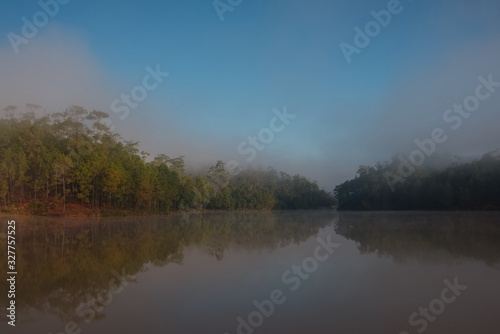 blue, lush, fresh, green, tree, symmetric, mirror, pine, background, beautiful, beauty, boat, calm, cloud, fog, forest, lake, landscape, morning, mountain, natural, nature, park, river, scene, season, sky, tour tourism, travel, view, water, surface