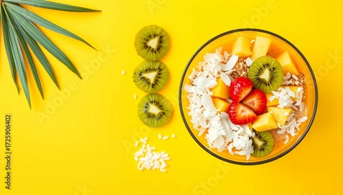 pineapple, kiwi, healthy breakfast, topview, tropical fruit, vegan, vegetarian, healthy lifestyle, exotic, fresh fruit, food photography, diet, organic, refreshing, sunshine, light background, alimentary, delicious, photogenic, natural light, wholesome, wellness, yellow background, vivid colors, detox
