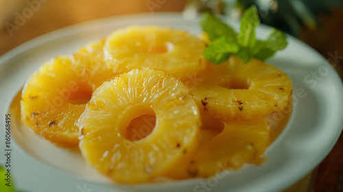 Pineapple, sliced pineapple rings on a white plate, bright kitchen setting, soft natural light, refreshing and tropical mood, neat and colorful presentation, casual tableware