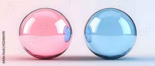 sphere, pink, blue, medicals, concept, background, white, glasses, shiny, transparent, health care, health, medicine, pill, capsule, glossy, bright, clean, abstract, design, illustration, technology, science, futuristic, modern, elegance, purity, balance, contrast, choice, option, decision, selection, 2, pair, couple, object, render, three-dimensional, digital, graphic, image, photo