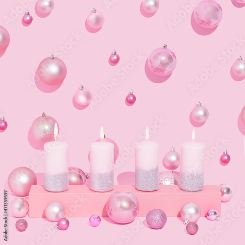 Pink Advent Candles in a row on a pastel pink background. Christmas balls. Fourth candle lit, symbolizes peace.