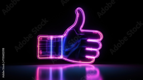 Pink and blue neon light like icon. Vibrant colored thumbs up technology symbol, isolated on a black background.