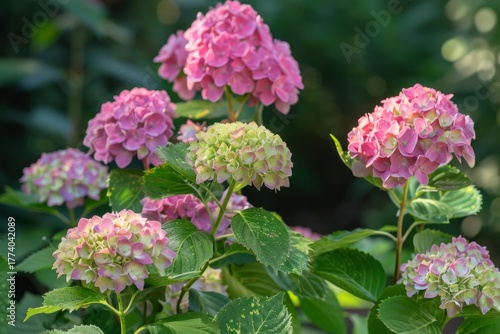 Pink and green hydrangeas blooming in a garden, adding a touch of beauty to the summer landscape