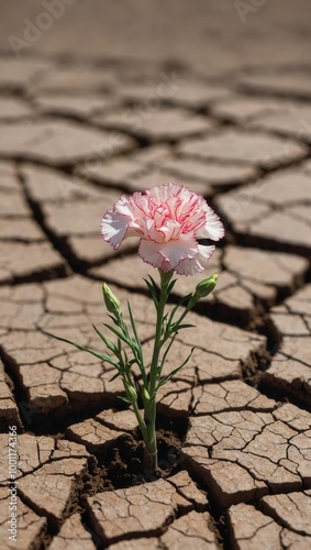 Pink and white carnation sprouting from cracked soil, barren environment, no people present