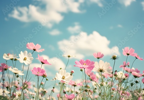 cosmos, flower, field, pink, white, sky, blue, cloud, garden, nature, floral, bloom, summer, spring, beauty, pastel, delicate, soft, sharpened, fisheye, canon, film, nostalgic, vintage, photo, background, wallpaper, artwork, illustration, landscape, floral pattern, floral arrangement, botanical