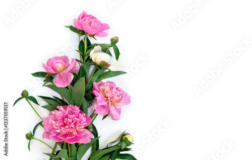 Pink and white peonies on a white background with space for text. Top view, flat lay