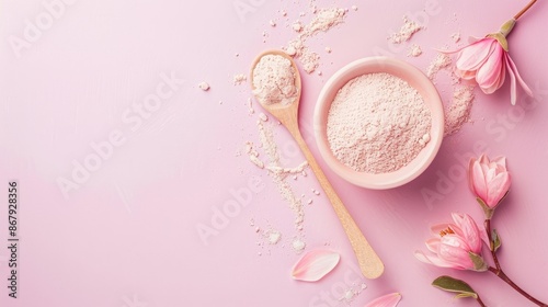Pink background with collagen powder a protein boost for beauty and health for skin bones joints and gut Made from plants or fish Flat lay with space for text