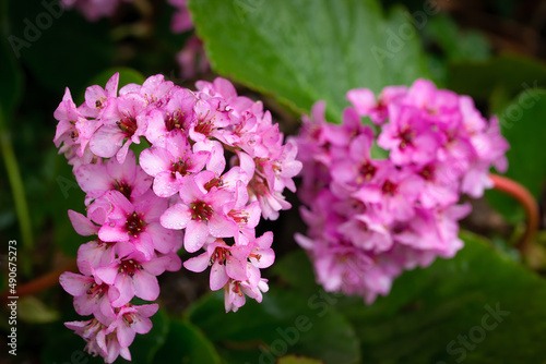 Pink Bergenia cordifolia flowers and green foliage and rain drops close-up in spring in south of France.