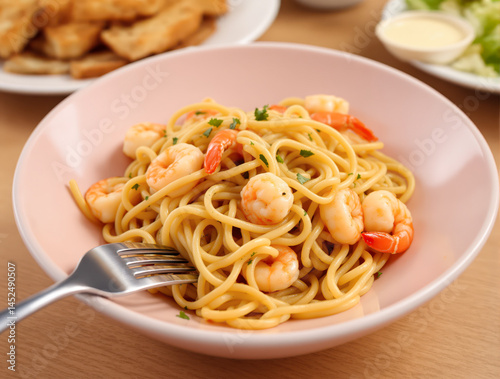 spaghetti, shrimp, pasta, olio, food, dish, cookery, plate, delicious, meal, dinner, lunch, tasty, appetising, cook, cooking, eat, eating, fresh, deliciously, epicure, culinary, italian, seafood, noodle, herb, parsley, pink, bowl, wooden, table, background, eatery, menu, receipe