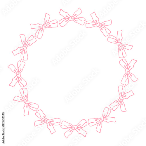 Pink bows in circle create a decorative wreath, design element for invitations, cards, and feminine projects
