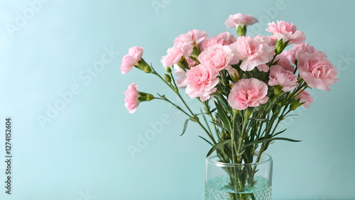 Pink Carnations in a Glass Vase on Pastel Blue Background with Copy Space. Perfect for: Mother's Day, Housewarming, Spring Celebrations, Interior Decor