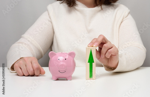 Pink ceramic piggy bank and wooden blocks with up arrow. Concept of increasing interest on a deposit in a bank