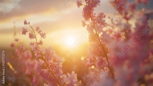 sunset, sunrise, cherry, blossom, flower, pink, bloom, spring, nature, beauty, floral, tree, branch, light, sun, warm, soft, delicate, pastel, romantic, serene, peaceful, tranquil, idylli, magical, dreamy, vibrant, gold, glow, field, landscape, garden, botany, flora, flowering, springtime, summer, season, sky, cloud, background, image, photo, picture