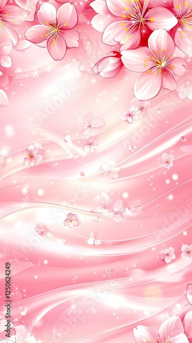 Pink cherry blossoms falling on swirling pink background; spring nature scene, ideal for greeting cards
