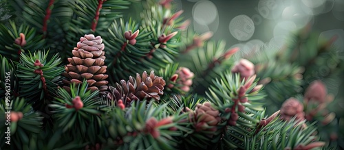 Pink cones on fir branches with evergreen foliage Green conifer background. Copy space image. Place for adding text and design